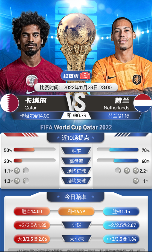 卡塔尔今届2轮小组赛均遭败场,攻防两端毫无建树,球队整体实力略显不足。荷兰目前世界排名第8位,球队喜欢运用身体优势,通过高位逼抢来取得中场控制权,也善于利用速度优势进行大范围攻防转换。初盘机构便开出荷兰让1.5球,并搭配超高水,外界对于客队信赖有加,各项数据均倾斜客队,即时让球数机构再次上调为客队让2/2.5球,机构持续力挺荷兰,各项数据支持有增无减。初盘进球数机构给出3/3.5球,即时盘也做调整,鉴于东道主此番是最后一场比赛,荷兰还是要给几分薄面,此番不妨考虑小球方向十拿九稳!
