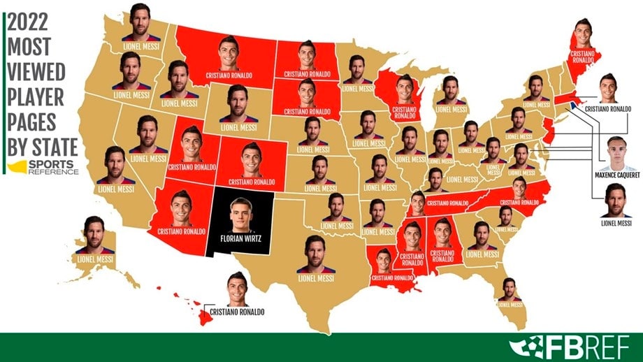 根据Stats Perform在2022年的数据,梅西和C罗是美国各州搜索(访问球员各自的官方页面)最多的球员。