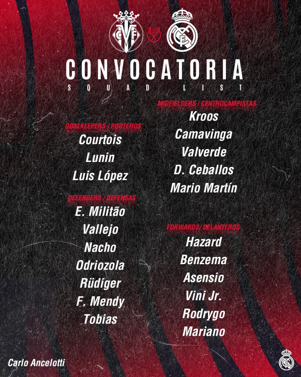 前锋:阿扎尔、本泽马、阿森西奥、维尼修斯、罗德里戈、马里亚诺